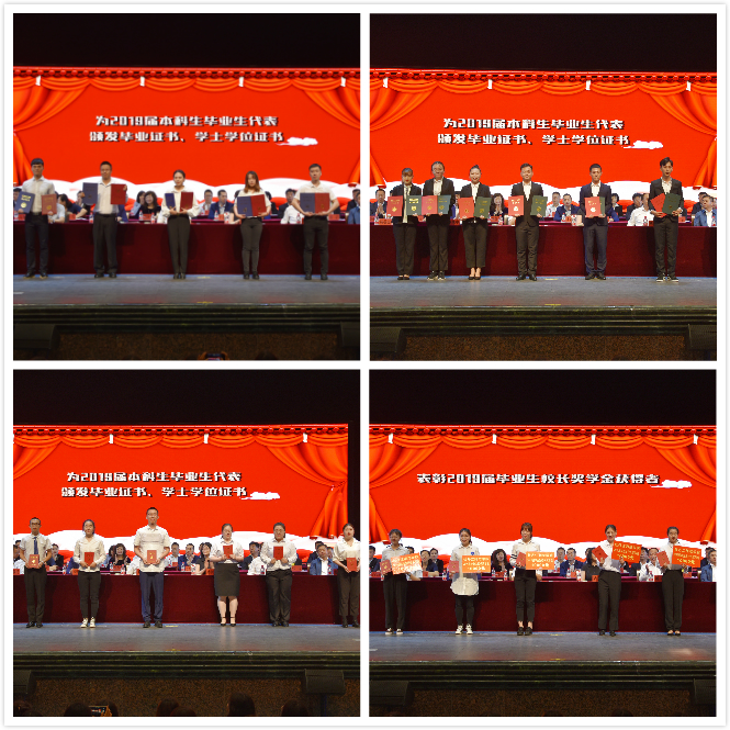 伴随着激昂的乐曲,与会领导为2019届本科毕业生代表、硕士研究生毕业生代表颁发了毕业证书、学位证书,为2019届毕业生先优代表颁发了荣誉证书,为2019届毕业生校长奖学金获得者颁发了证书和奖金。