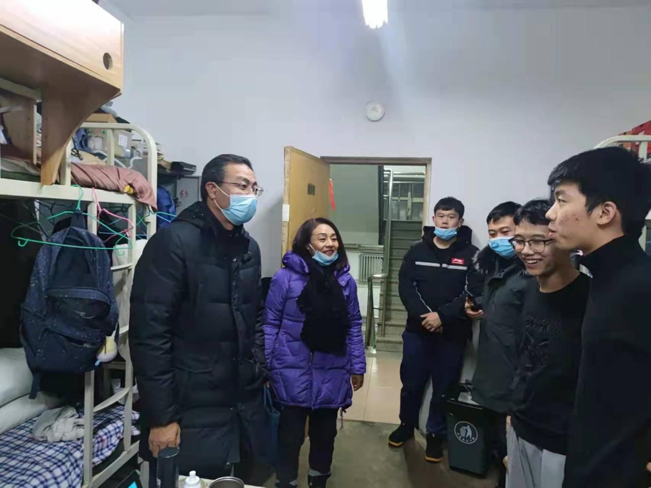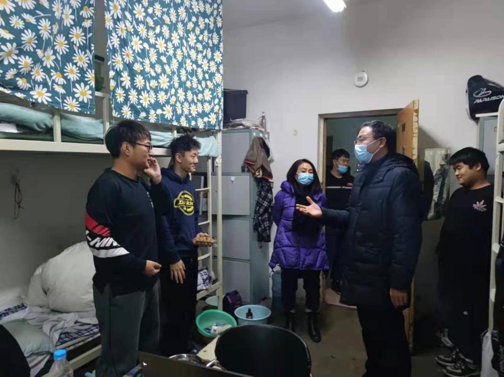 为进一步落实落细学校疫情防控管理工作,12月9日晚,学校党委常委、组织部部长赵超深入5号和6号学生公寓走访,实地了解疫情期间学生在期末复习阶段的思想动态和学习生活情况,为学生送去关心和问候。学校纪委副书记马少霞、公寓值班辅导员刘学、学生工作部张诗雨陪同走访。