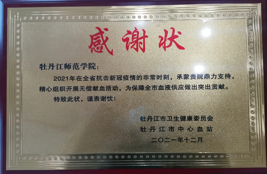 12月21日,牡丹江市卫生健康委员会、牡丹江市中心血站为我校送来感谢状。对我校在全省抗击新冠疫情的非常时刻,组织师生开展无偿献血活动,保障全市血液供应作出的突出贡献表示衷心的感谢和崇高的敬意。