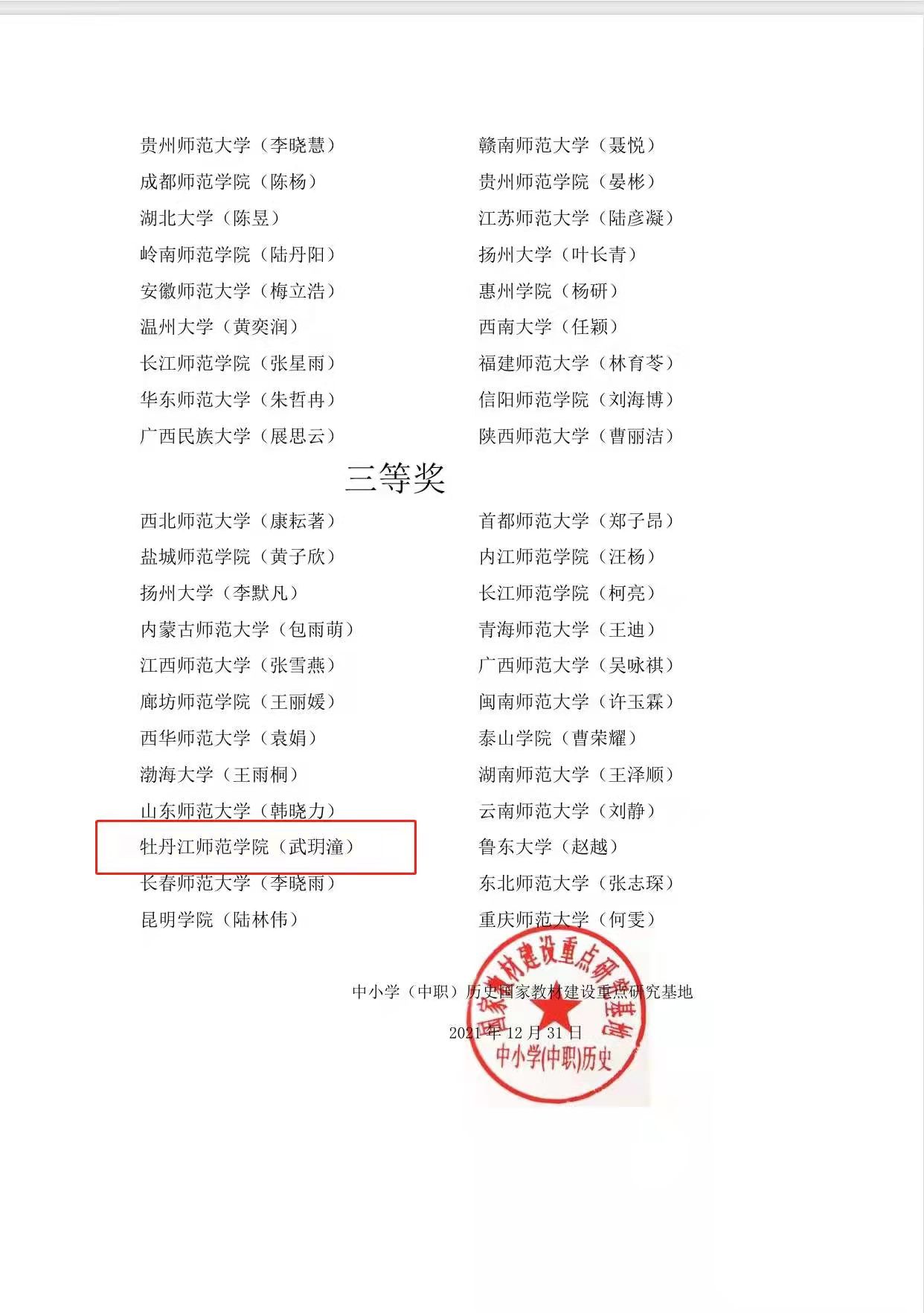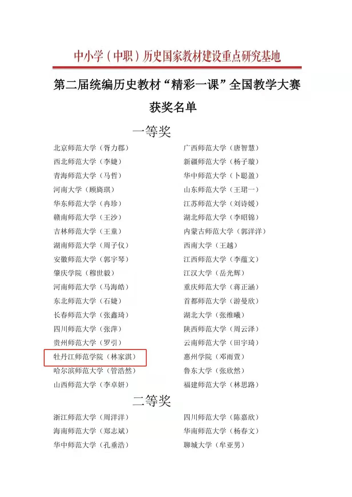 近日获悉,我校学生在第二届统编历史教材“精彩一课”全国教学大赛中喜获佳绩。其中,历史与文化学院历史学专业2019级学生林家淇荣获一等奖,武玥潼荣获三等奖。