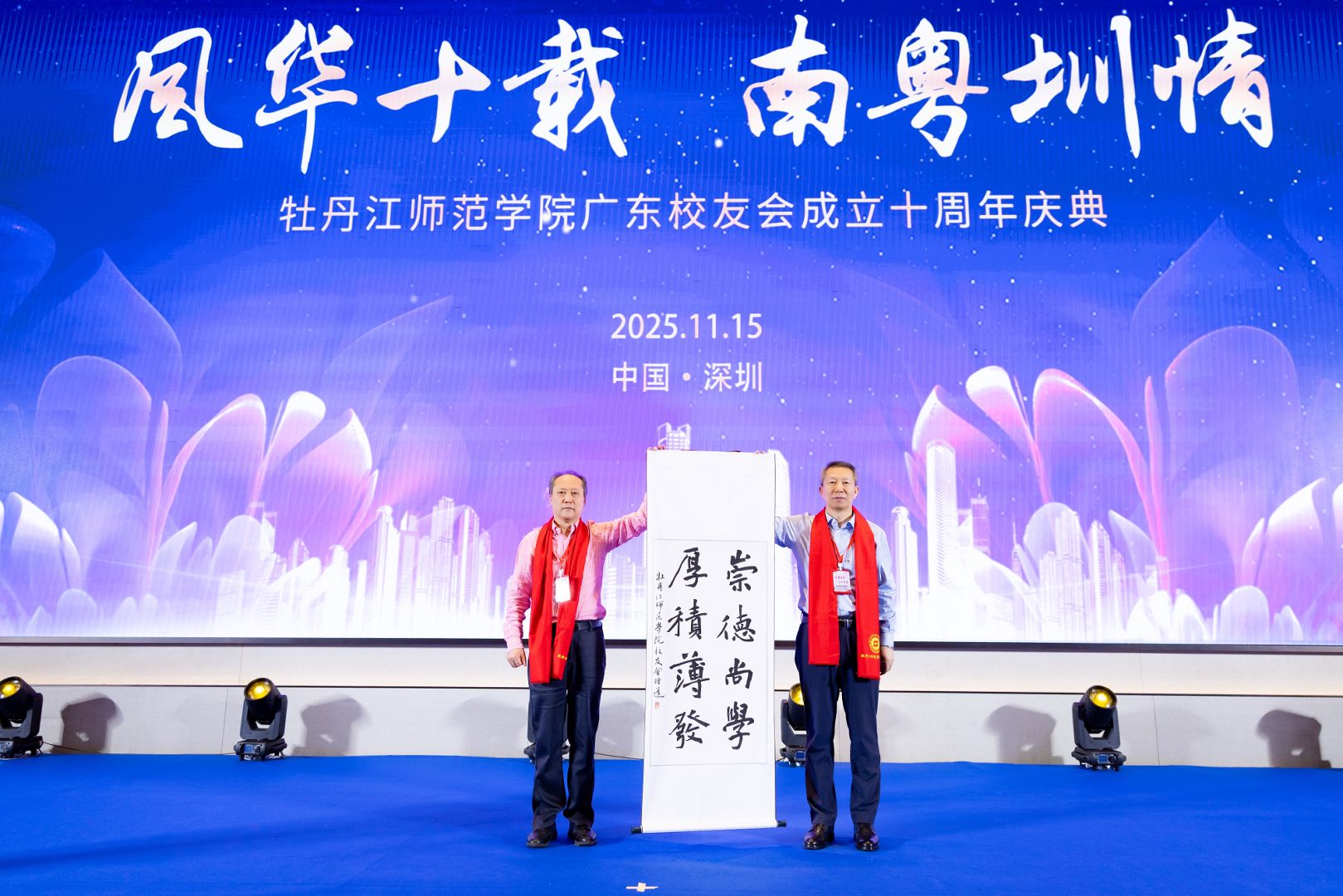 庆典现场暖意融融,情意绵绵。丛喜权代表学校送上校训“崇德尚学 厚积薄发”书法作品;北京、上海、牡丹江等兄弟校友分会纷纷送上校友文化纪念品,表达跨越地域的深厚情谊;大连、哈尔滨、佳木斯、绥化、鹤岗、湖北等地校友分会发来祝福视频,共同祝愿广东校友分会十周岁生日快乐。