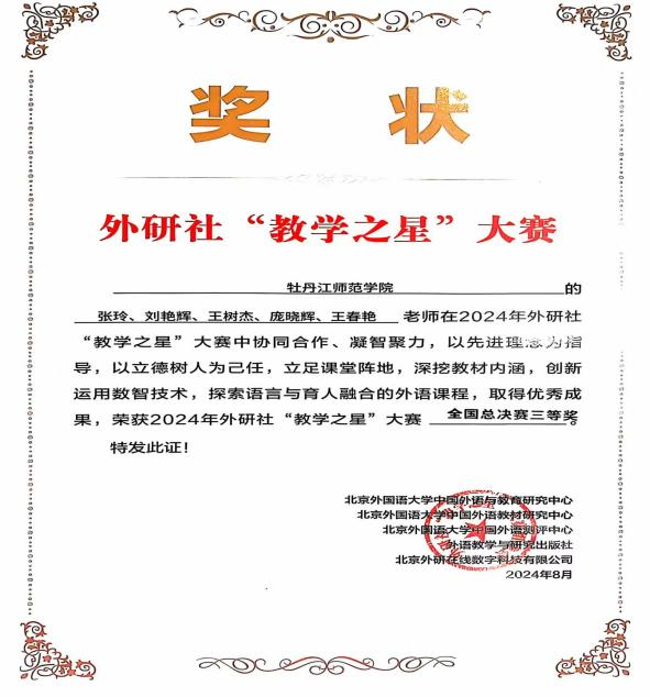 此次比赛彰显了我校教师的团队魅力与精神风貌,展示了西方语言学院教师良好的教学能力与专业素养。“理解当代中国”读写课程教学团队在学校、学院领导和老师们的大力支持与鼓励下,团队成员通力合作,集思广益,精心准备,认真钻研,坚持语言教学与育人融合的教学设计理念,将习近平新时代中国特色社会主义思想有机地融入到课程设计中。积极探索数字赋能教学的有效途径,努力提高教学效果。据悉,2024年外研社“教学之星”大赛以“外语教材的有效使用:数智融合,创新育人”为主题,引领教师落实立德树人根本任务,探索数字赋能教学创新,切实提升教学育人效果。通过本次比赛,教师们对“数智融合,创新育人”有了深层的理解,对落实立德树人根本任务,帮助教师更新教育理念、优化课程设计、提高教学效果方面具体积极作用。