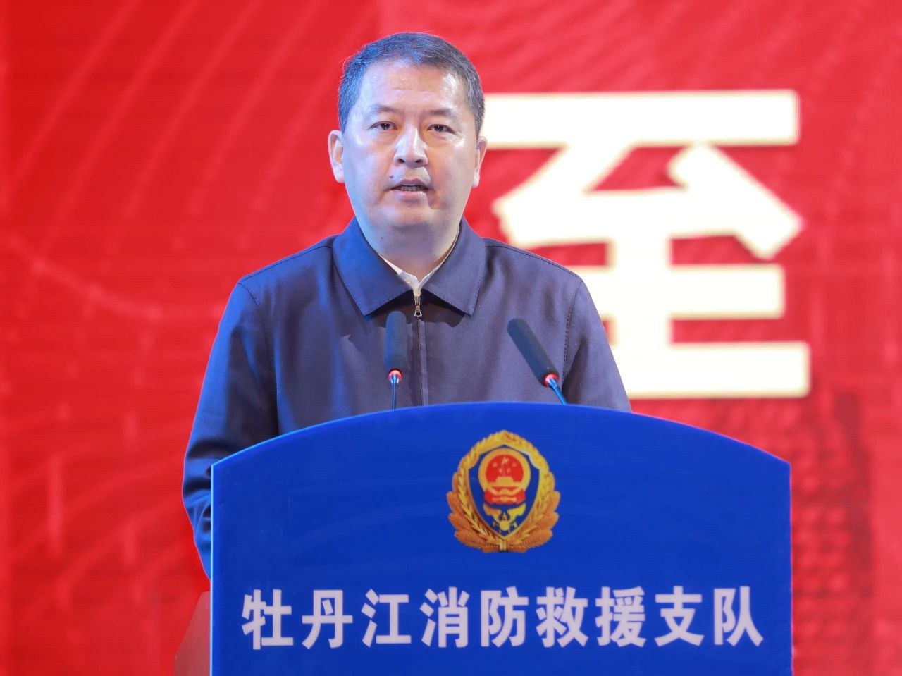 牡丹江市委常委、市政府常务副市长黄士伟讲话并宣布2024年牡丹江市消防宣传月暨“护航亚冬”安全生产百日攻坚行动正式启动,并代表市委、市政府向站在世界消防救援锦标赛最高领奖台的消防健儿们表示热烈的祝贺!向长期以来奋战在防灭火第一线的消防救援人员和广大专兼职消防工作者、消防志愿者表示诚挚的问候,充分肯定近年来我市消防工作。他强调,第9届亚冬会已进入百日倒计时,各地要树立全局意识,各级各部门、社会各界人士均要树牢“全民消防、生命至上”理念,坚持政府统一领导、部门依法监管、单位全面负责、公民积极参与的原则,以“防大火、控小火、遏亡人”为目标,努力为“除患保安·护航亚冬”安全生产百日攻坚行动提供坚强力量保障。