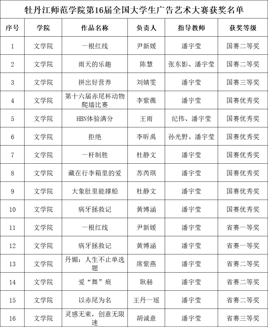 近日,第16届全国大学生广告艺术大赛评审工作圆满结束。经组委会评审,我校学生在全国总决赛中荣获国赛二等奖2项、三等奖1项、优秀奖7项,在黑龙江省赛中荣获一等奖2项、二等奖3项、三等奖1项、优秀奖35项。实现了该赛事在国赛获奖数量和名次上的双突破。