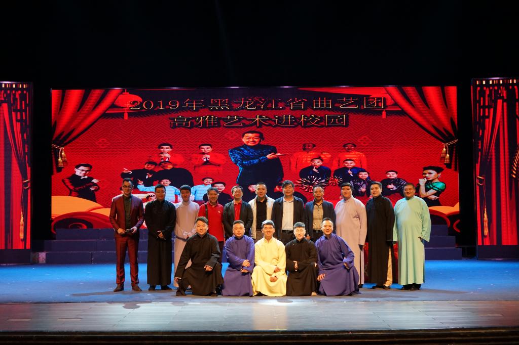 为贯彻落实党中央和国务院提出的“进一步推进高雅文化进校园活动,丰富校园文化生活,提高学生艺术修养”的要求,丰富校园文化生活,增强学生对高雅艺术感受力,提升学生的艺术素养,进一步强化美育育人功能,促进学生德智体美全面发展,6月3日晚,“高雅艺术进校园”黑龙江省曲艺团专场演出在我校音乐厅举行。校党委常委、宣传统战部部长秦植林,以及各二级学院师生代表共1000余人共同欣赏了高雅的艺术盛宴。