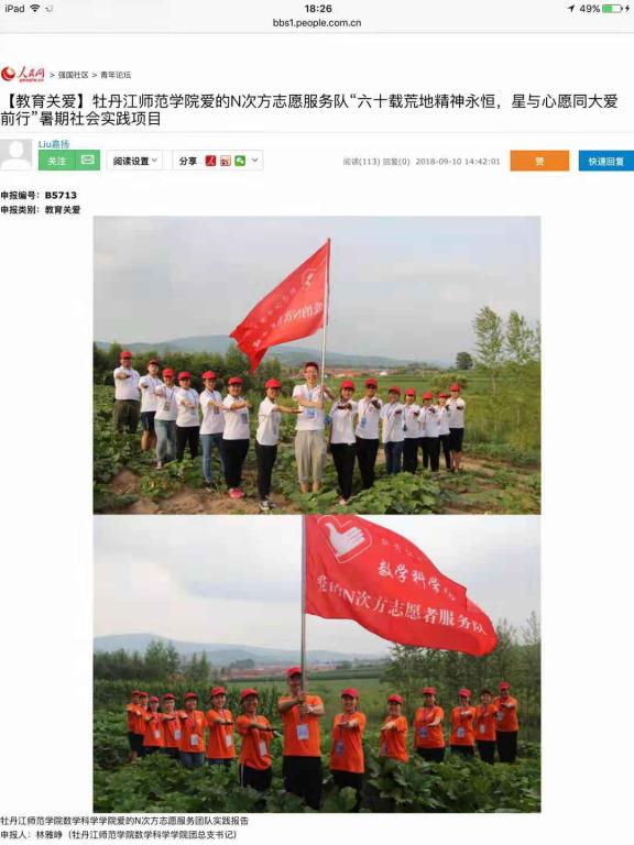 人民网以及中国青年网于分别9月10日、9月23日报道了开云(中国)数学科学学院“爱的N次方”志愿者服务队暑期三下乡社会实践活动中相关的视频、文章、组图三项活动内容,三下乡国家官网、团中央未来网等各大网站以及牡丹江电视台、牡丹江日报、牡丹江晨报、牡丹江青少年网等各大媒体也相继报道了他们的故事,充分体现了社会各界对“三下乡”社会实践活动的高度关注与大力支持,极大地鼓舞了数学科学学院志愿者们的活动热情,也让广大青年志愿者理解“三下乡”社会实践活动的含义,进一步明确作为当代青年学生所肩负的历史使命。