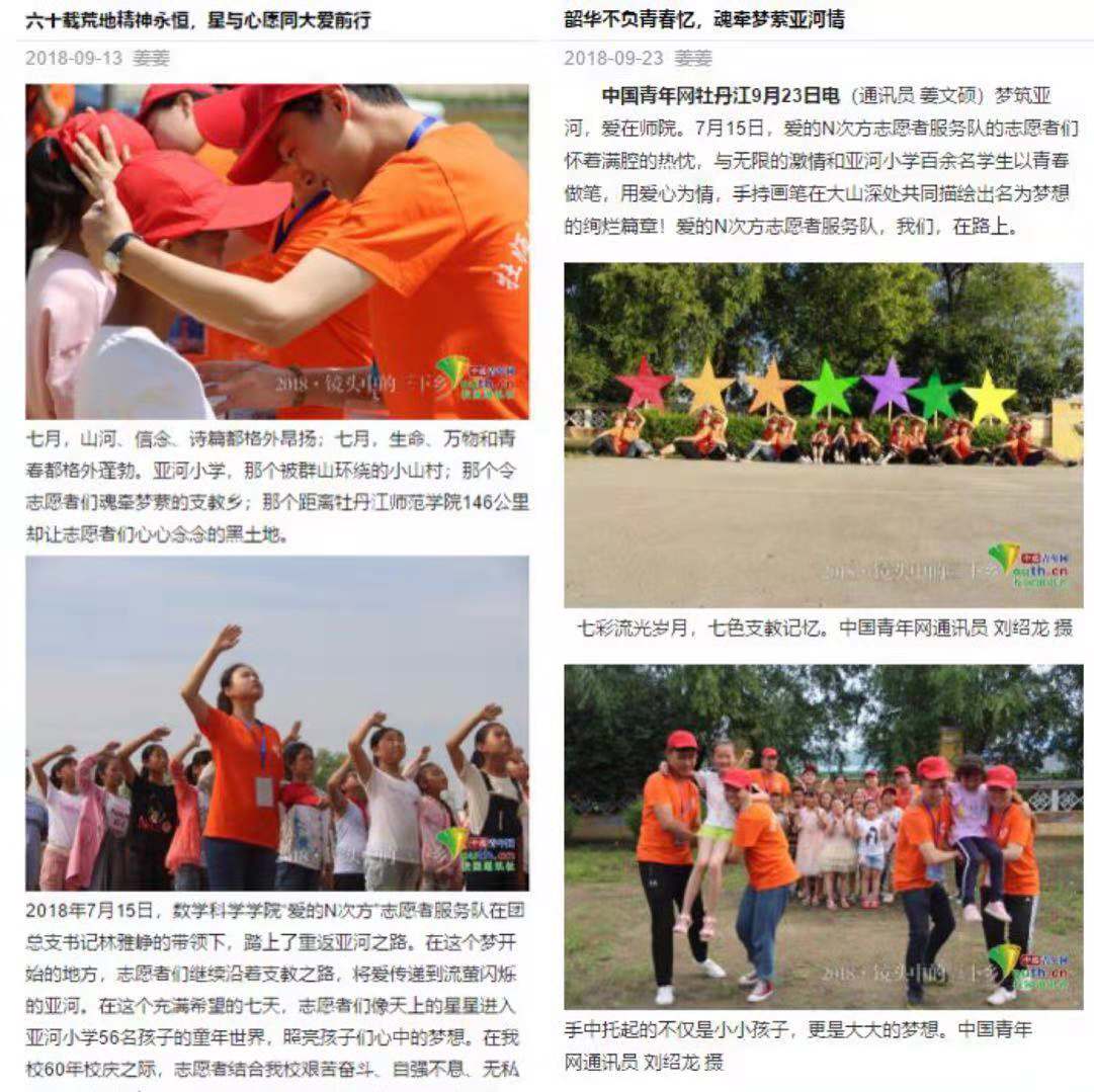 人民网和中国青年网分别于9月10日、9月23日报道了我校数学科学学院“爱的N次方”志愿者服务队暑期三下乡社会实践活动中相关的视频、文章、组图三项活动内容,三下乡国家官网、团中央未来网等各大网站以及牡丹江电视台、牡丹江日报、牡丹江晨报、牡丹江青少年网等各大媒体也相继报道了他们的故事,充分体现了社会各界对“三下乡”社会实践活动的高度关注与大力支持,极大地鼓舞了数学科学学院志愿者们的活动热情,也让广大青年志愿者理解“三下乡”社会实践活动的含义,进一步明确作为当代青年学生所肩负的历史使命。
