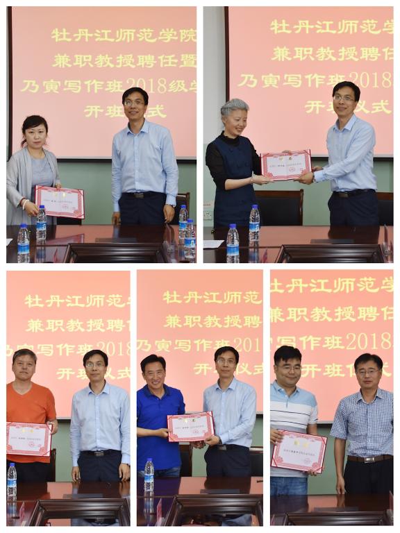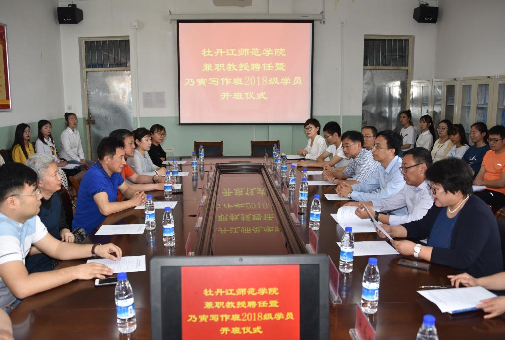6月12日下午,学校在文科楼316会议室举行兼职教授聘任暨“乃寅写作班”2018级学员开班仪式。仪式上,聘请田成章、库玉祥、邵玫英、高艳四位作家为学校兼职教授;聘请周金平为文学院兼职教授。校党委常委、副校长杨敬民,文学院院长孙英杰、党委书记王海志、副院长吴媛媛,“乃寅写作班”全体师生参加仪式。仪式由文学院副院长吴媛媛主持。