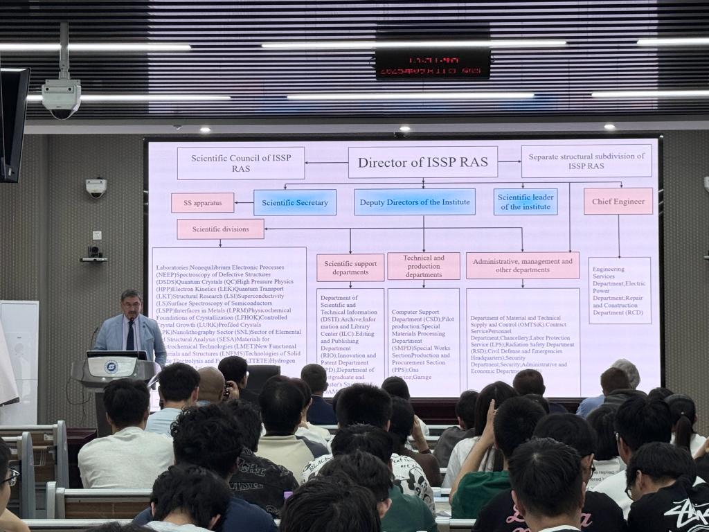 列夫琴科·亚历山大·阿列克谢耶维奇院长带来了一场精彩的大师公开课,介绍了俄罗斯科学院固体物理研究院的发展脉络与组织架构,从学科方向、科研平台、成果转化等维度,全面解读了俄方在功能材料领域的研究兴趣与技术优势。这场兼具专业性与实用性的分享,不仅让在场师生对俄方科研实力有了更直观深入的认知,更为双方后续在细分研究方向上的精准协作,搭建了清晰的沟通桥梁,夯实了合作基础。