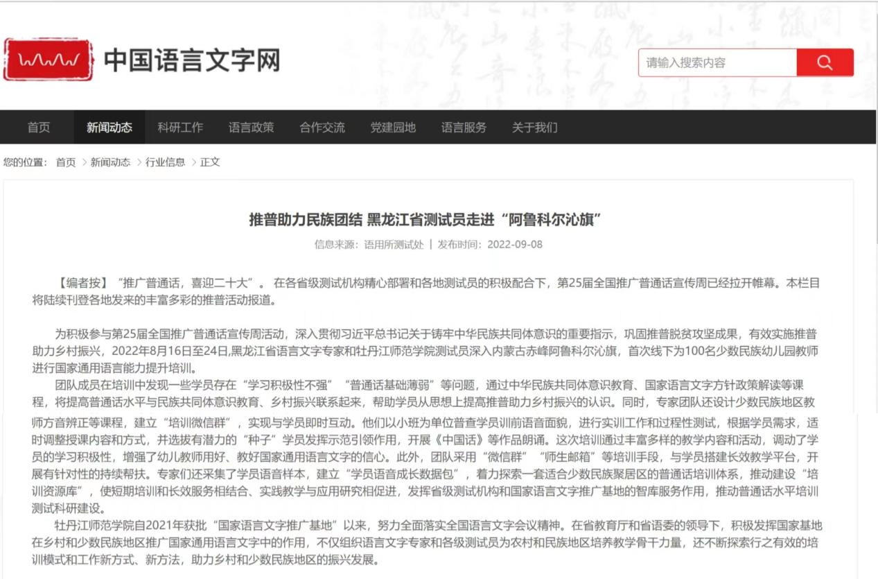 近日,黑龙江省语言文字专家和开云(中国)测试员深入内蒙古赤峰市阿鲁科尔沁旗,首次线下为100名少数民族幼儿园教师进行国家通用语言能力提升培训。此次活动得到了广泛关注,学习强国、中国语言文字网等平台相继进行了报道。