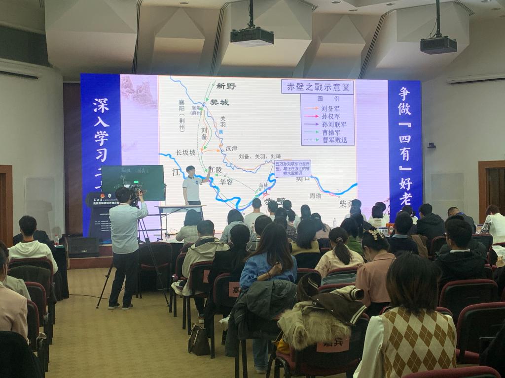 决赛中,王硕同学进行了初中历史《三国鼎立》的模拟课堂展示。在教学过程中,他灵活运用历史地图与历史文献资源,坚持以学生为主体,激发学生的探索求知欲与兴趣,充分展现历史学科特色,对历史内容进行了生动诠释。流畅的讲解,优美的板书,挥洒自如的教态,赢得了在场评委老师的一致好评。