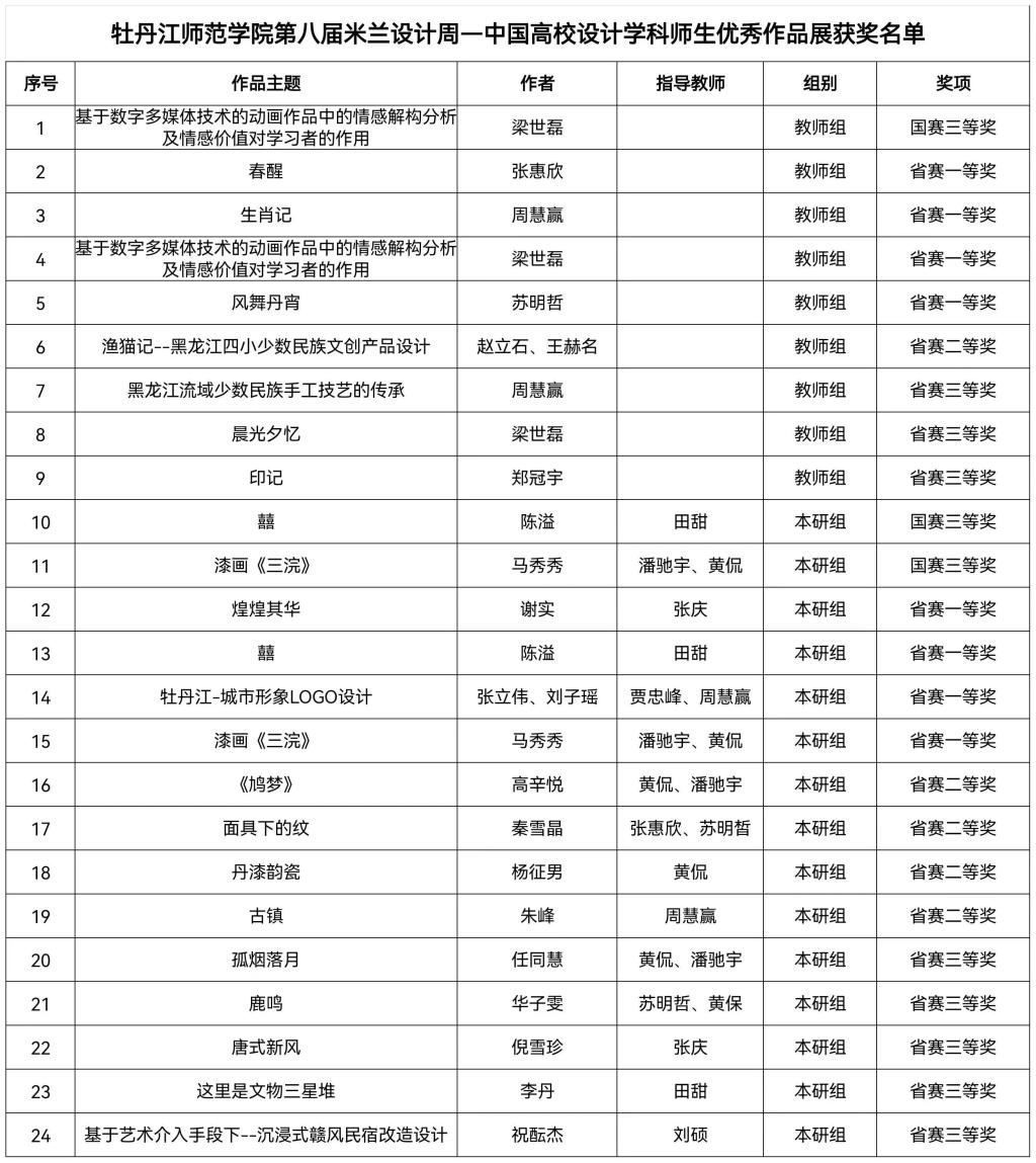 近日,第八届米兰设计周——中国高校设计学科师生优秀作品展全国总决赛圆满落幕。我校美术与设计学院荣获教师组国赛三等奖1项、省赛一等奖4项、二等奖1项、三等奖3项;本研组国赛三等奖2项、省赛一等奖4项、二等奖4项、三等奖5项。自赛讯发布以来,学校高度重视此项竞赛,统筹安排、广泛动员学生参赛。美术与设计学院本着实践创新教赛联动的教学理念,积极组织师生认真备赛、反复推敲、创作交流,促进师生在比赛过程中收获成...
