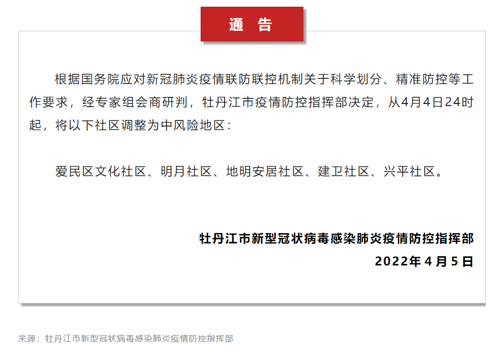 本文转自:网信牡丹江根据国务院应对新冠肺炎疫情联防联控机制关于科学划分、精准防控等工作要求,经专家组会商研判,牡丹江市疫情防控指挥部决定,从4月4日24时起,将以下社区调整为中风险地区:爱民区文化社区、明月社区、地明安居社区、建卫社区、兴平社区。牡丹江市新型冠状病毒感染肺炎疫情防控指挥部2022年4月5
